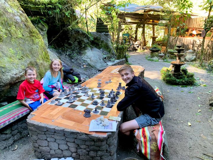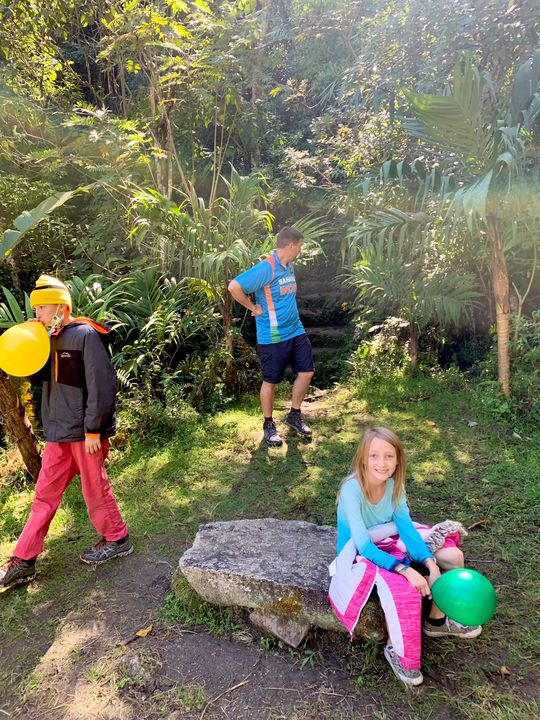 After that we still had quite a large chunk of time before our train was set to leave so I suggested we do one last short hike I’d heard about up to a waterfall called Alcamayo Cascades. The kids weren’t super excited about hiking AGAIN, and complained a little as we headed up, but then they discovered that the hike had darling little miniature rock cities sculpted along the way, as well as a giant chess board with hand made pieces. The trail was owned by a local family, who were very skilled in rockwork and had made the trail really cute. They too had two darling little boys so we were once again able to share our balloons and gifts with them as well. Their parents were so touched.