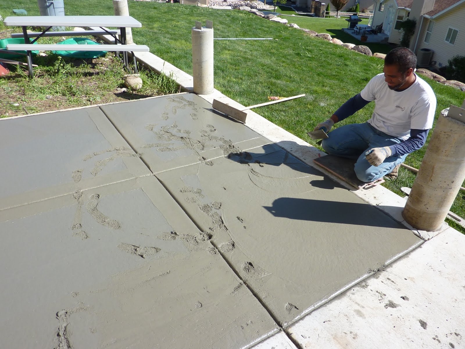 Back in May we were also able to finish up a few of our yard projects that we didn’t have the time or money to do last summer. We had our awesome neighbor Tuli come over and he and his crew were able to extend our back porch (giving us another 10-12 feet of room) as well as put in a patio down by our fire pit. Everything went really smoothly until our sweet little Dawson escaped from the house (figured out how to open the locked basement door) and meandered ONTO our new cement. Bless his heart he left quite a mark and a bit more work for our awesome cement friends. Below are some pics from the day.